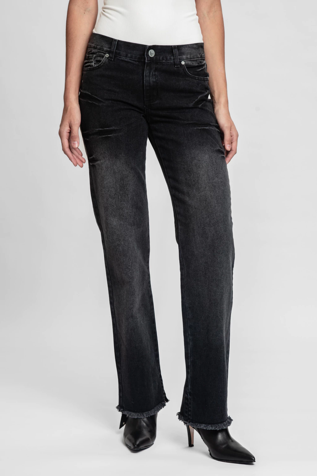 Denim Color Negro, de calce recto y tiro bajo, con caída relajada y botamanga desflecada con abertura lateral. Presenta técnica de lavado aplicada en el frente, tambien localizado en piernas de ambos lados, tecnica laser, generando líneas que aportan diseño y efecto visual sutil.