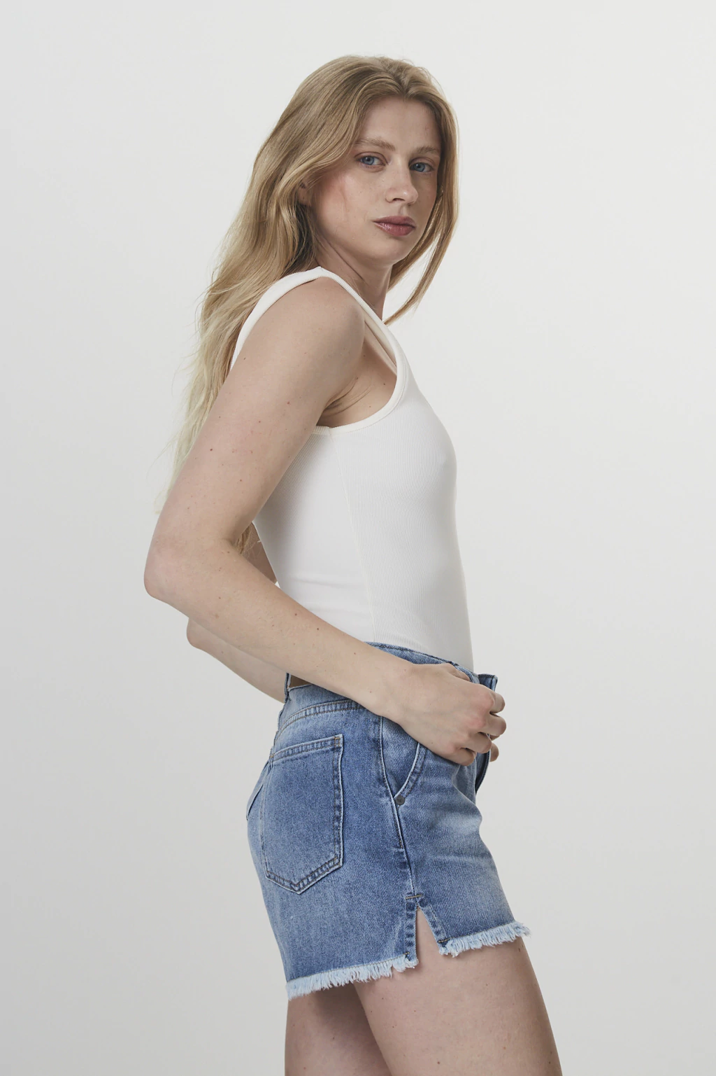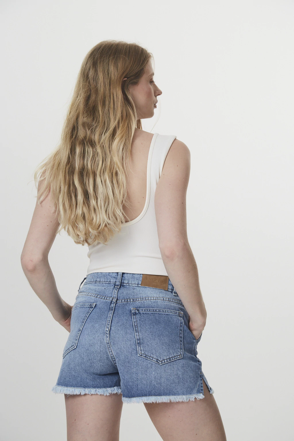 Short denim de tiro medio, confeccionado en denim 100% algodón con estructura firme y tacto suave.